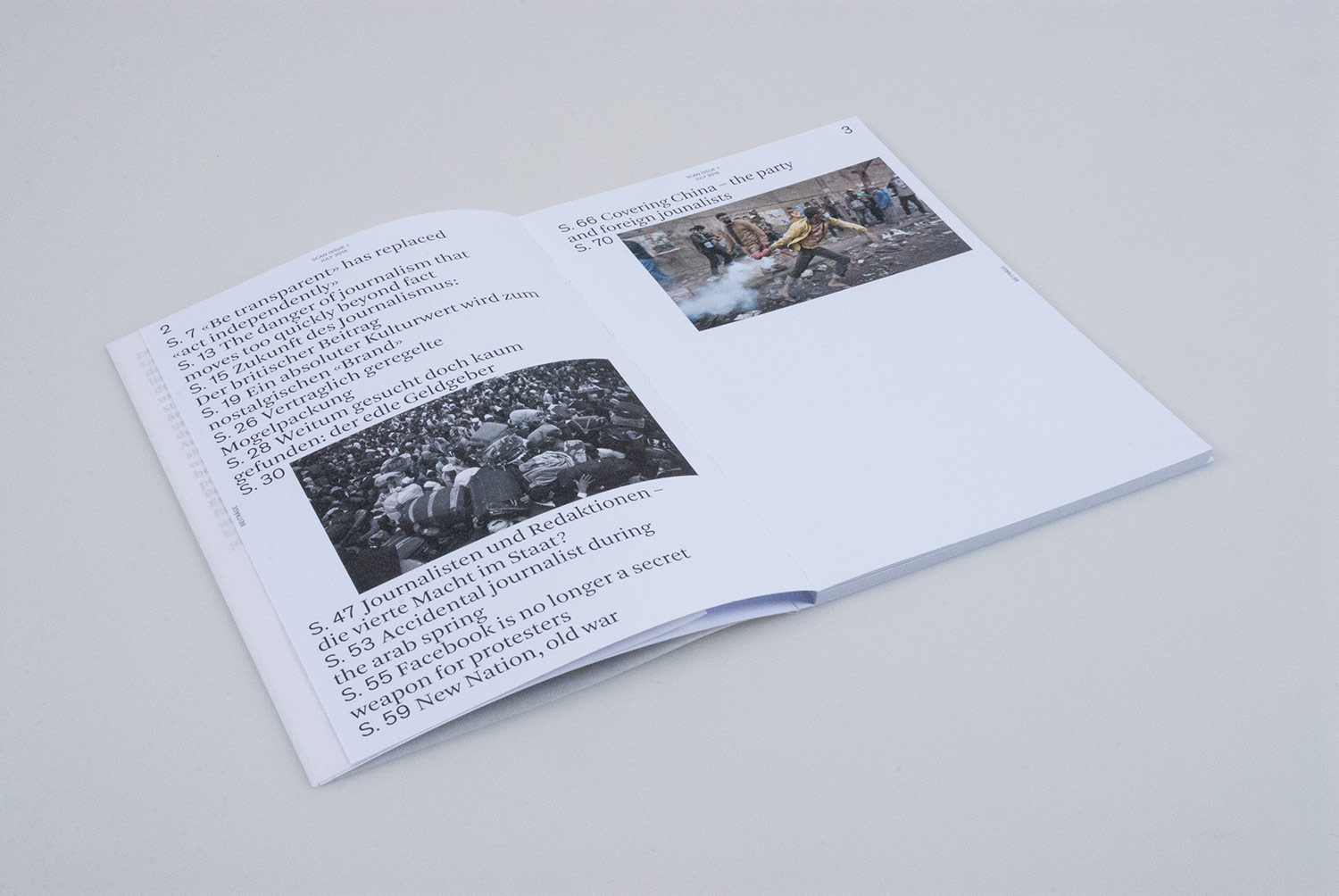 Das Gestaltungskonzept beruht auf der Überlegung, dass je länger man sich mit einem Thema beschäftigt, desto detaillierter und spezifischer werden die Informationen mit denen man sich beschäftigt. In der Gestaltung des Magazins ist dieser Überlegung im Umgang mit Typografie, Layout und Material Rechenschaft getragen. Die jeweilige hierarchische Position einer Information wird somit durch Schriftgrösse, Spaltenbreite und Position innerhalb des Bundes ablesbar.